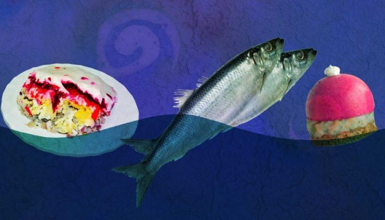 Balıkları yemeğin üzerine koyun, soğanla örtün ve mayonezle fırçalayın. Sonra elmaları, yumurta tabakasını ve mayonezi dağıtın. Havuç ve pancarları üstüne yerleştirin.